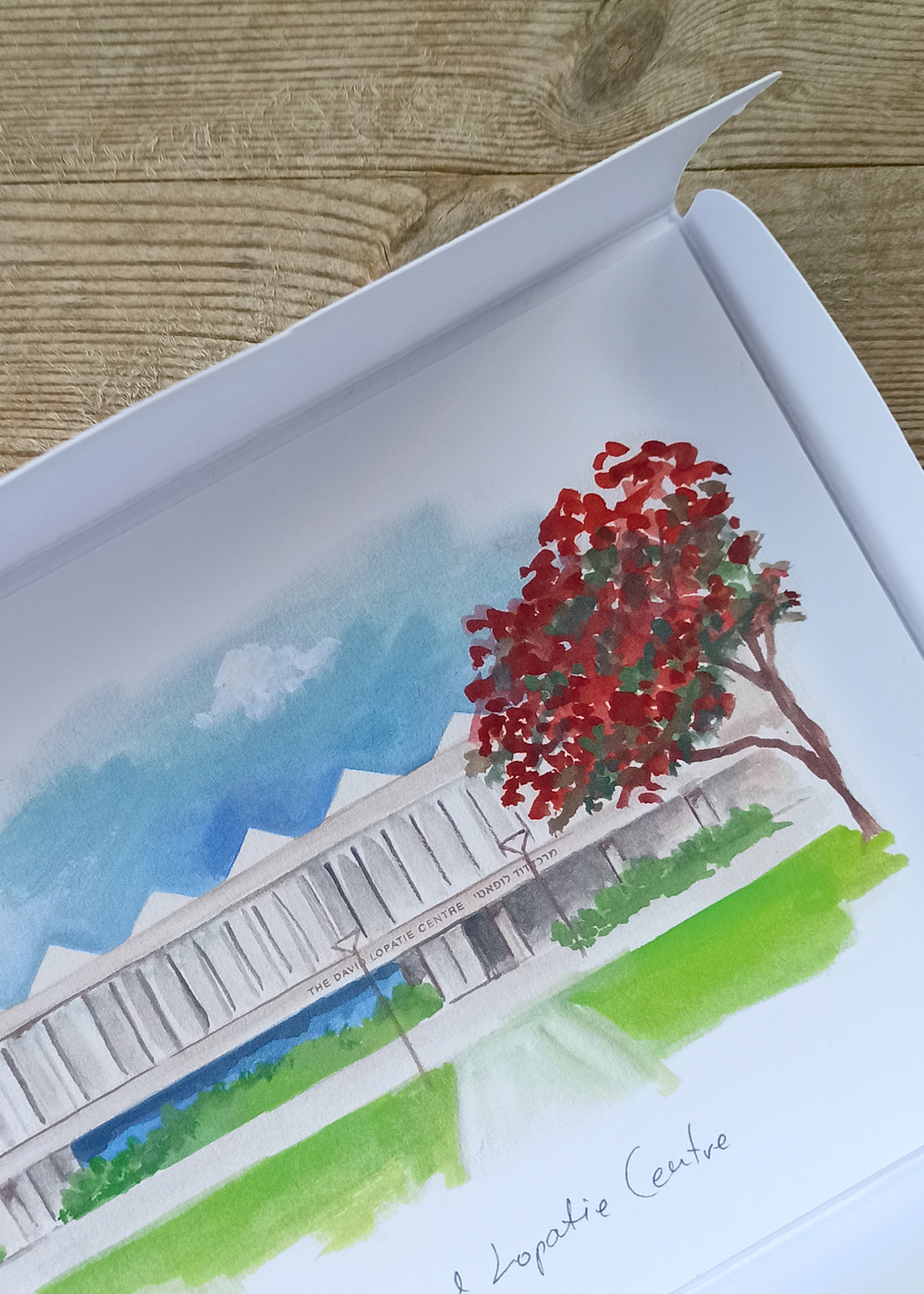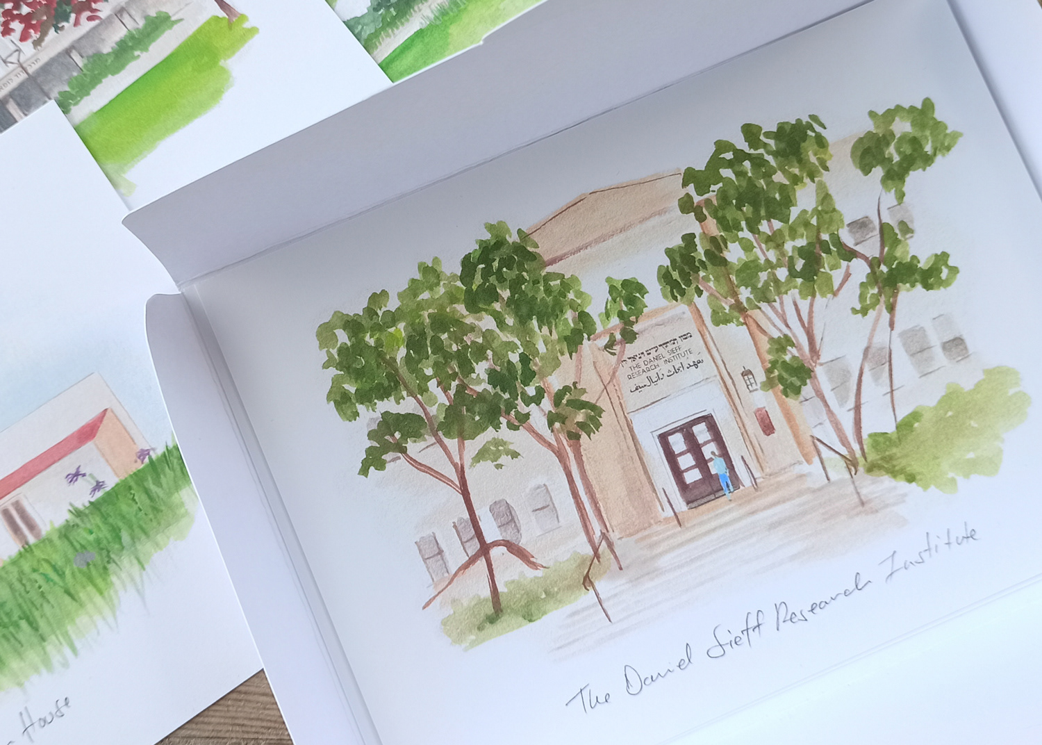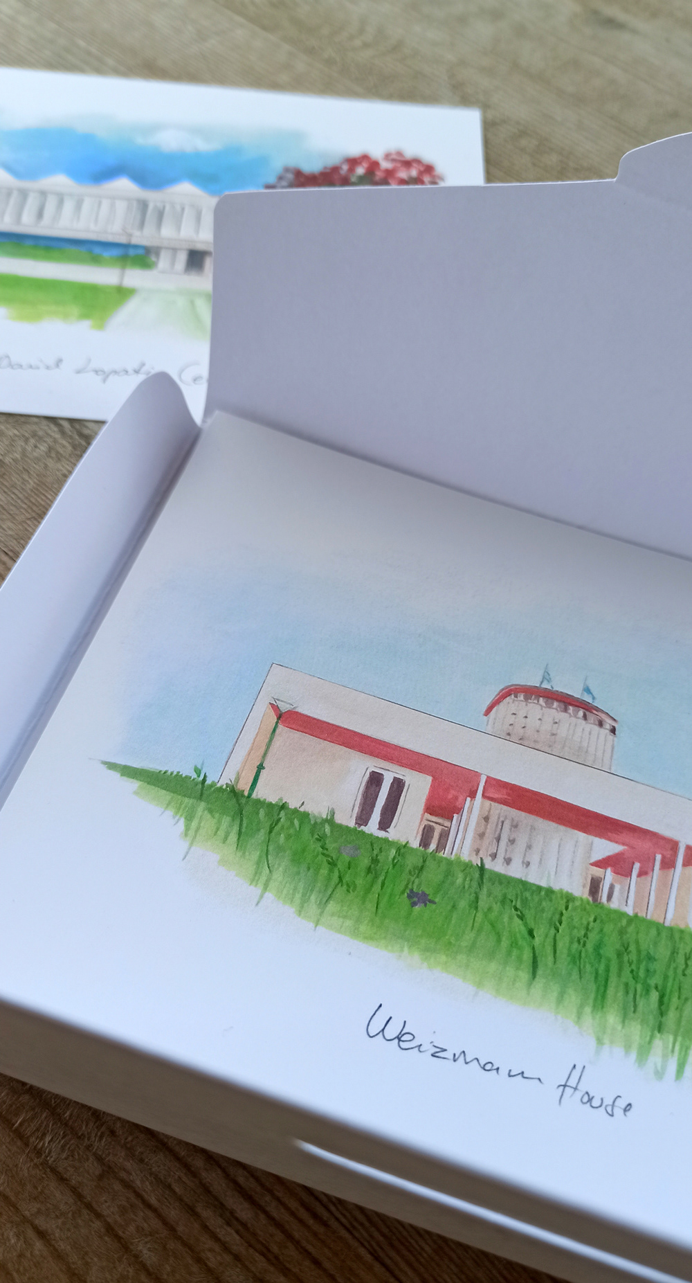 A set of postcards created for the Weizmann Institute of Science Visitors Center, capturing iconic buildings on the institute’s campus. Delicate and detailed watercolor paintings, each illustration reflects the beauty and significance of this renowned institution. The set is available in the visitor center shop and as an exclusive giveaway for distinguished guests.